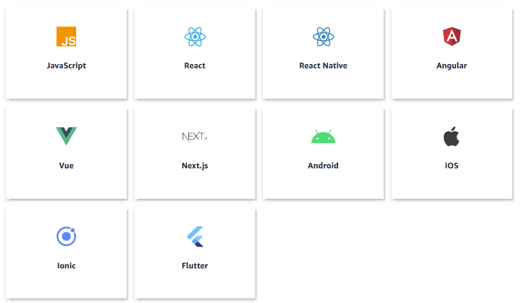 Languages/Platforms supported by AWS Amplify. From front-end focused to mobile specific, Amplify helps you pick the right tool for the job.