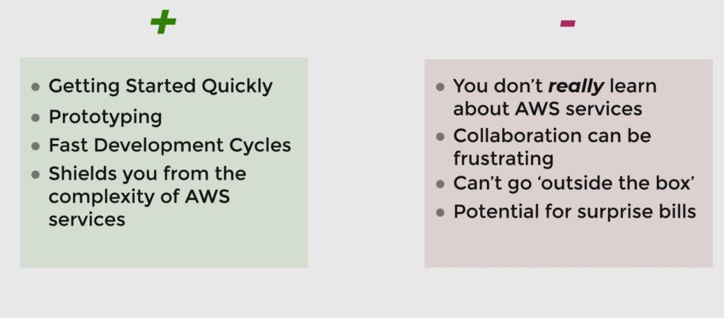 For some, this may not be a problem since they just want to rapidly develop. For others that are looking to get exposed in detail to AWS services and also learn how launch your production application, you may want to look at other choices such as CDK.