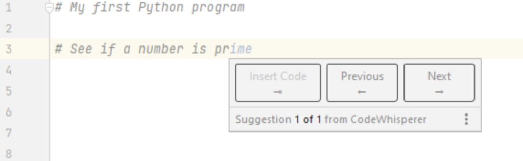 Autocomplete support is not just limited to the code you’re typing. According to AWS, “CodeWhisperer will continually examine your code and your comments, and present you with syntactically correct recommendations. The recommendations are synthesized based on your coding style and variable names, and are not simply snippets.”