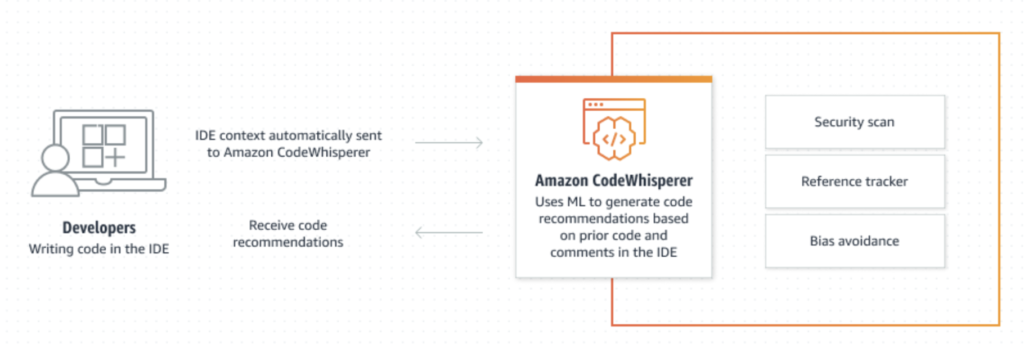 Once the plugin is enabled in your editor, CodeWhisperer automatically sends code base details to AWS. The project details, code, comments, and other details are analyzed by CodeWhisperer and run through a security scan, reference tracker, and bias advoidance system. Suggestions are automatically generated based on the ML system trained on billions of internal datasets. Finally, code suggestions are transmitted back to your IDE where they can be previewed and added.