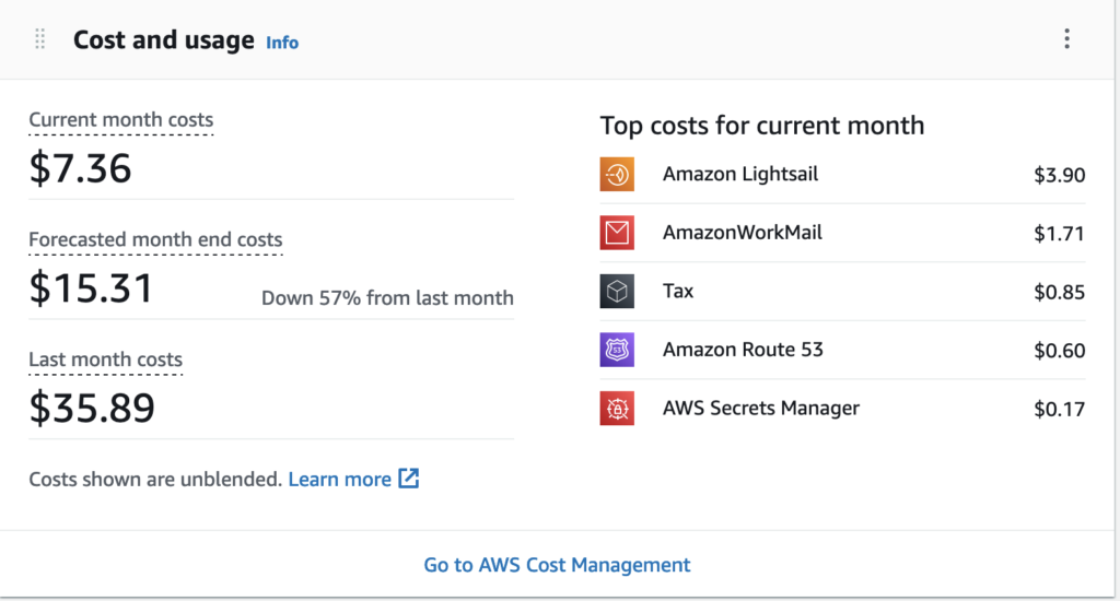 The widget shows you the top services you’ve spent on so far this month in descending order. This is a really handy feature that has helped remind me on numerous occasions to tear down an unused resource. This tip in conjunction with using billing alerts should effectively safeguard you from any surprise bills.