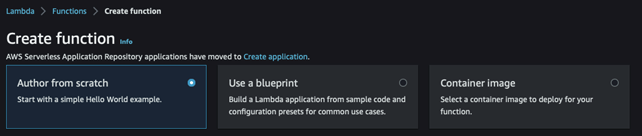 As we are not adding any dependencies we can choose ‘Author from Scratch’ and edit our code later in the console. Lambda will zip it and store it for us.