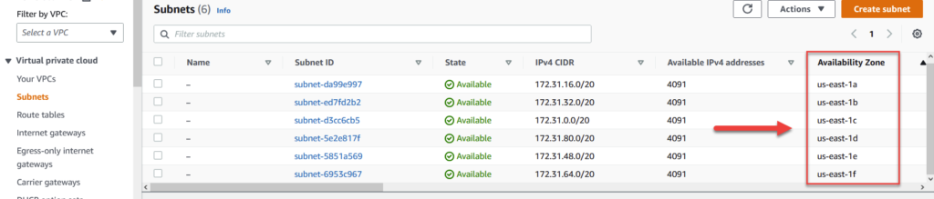 Your default VPC already comes with subnets across each availability zone in every region. So for example, in us-east-1, my account has six public subnets across us-east-1a, 1b, 1c, 1d, 1e, and 1f. You can see this in the image below under the subnets section in the VPC section of the AWS console.