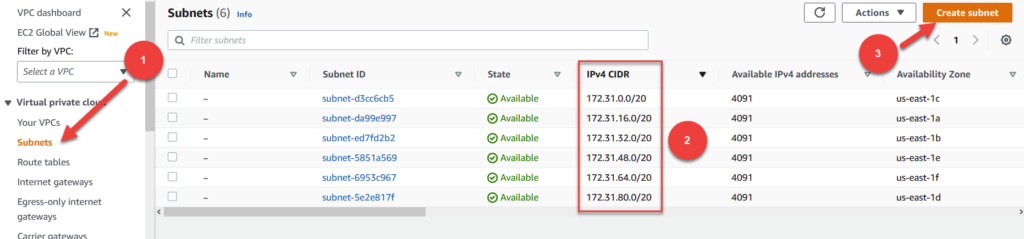 If we look at row 1 (subnet 1) in the table (2), it has a CIDR block of 172.31.0.0/20. This means that any piece of infrastructure deployed in this subnet can have an IP address that ranges from 172.31.0.0 to 172.31.15.255. Note that 255 is the maximum range a section of the block can go up to. This pattern continues for our second subnet with a CIDR block of 172.31.16.0/20. It has a range of 172.31.16.0 to 172.31.31.255.
