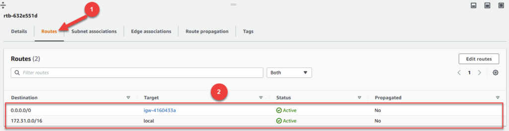 To access your route table, click on Routes as seen in (1). From there, we are shown a list of routes (2) in a table. The first row with a destination of 0.0.0.0/0 means that all traffic that is trying to access the public internet needs to flow through the target. In this case, the target is our internet gateway that comes with our account by default.