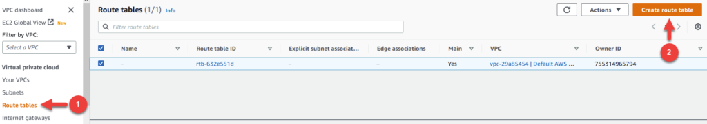 To do so, click on Route tables as seen in (1) below. Notice on the next page, we only have one route table – the one that is currently assigned to our main VPC. Create route table in the top right as seen in (2).