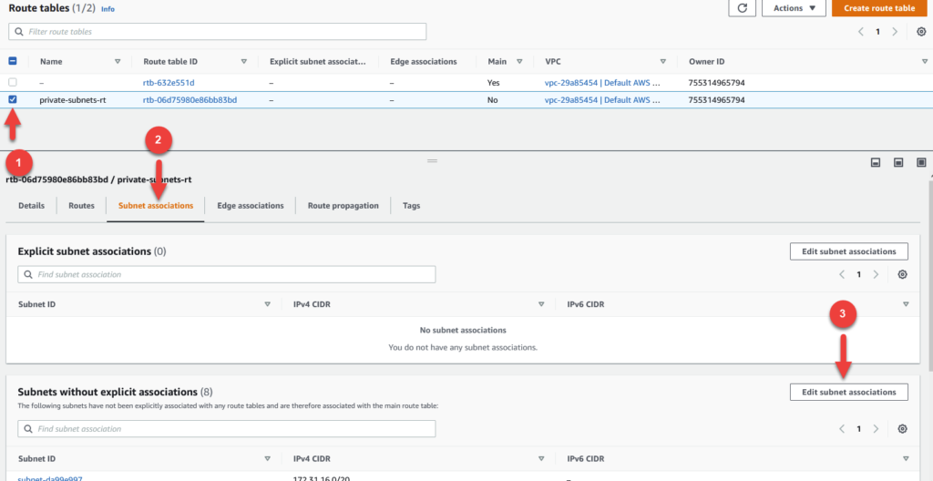 Click on Subnet associations in this menu area (2) and scroll down to where it says Subnets without explicit associations. Click on Edit subnet associations (3).