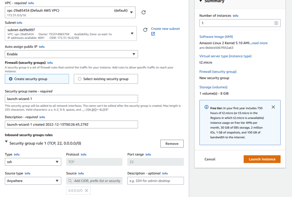 Notice under inbound security group rules the rules that the wizard is proposing. This rule is of Type SSH, uses the TCP protocol, and has source type as anywhere. This will allow you to connect to this instance from any machine on the internet. If you would like to restrict this to only your IP address, click on the Source type dropdown, and select My IP.