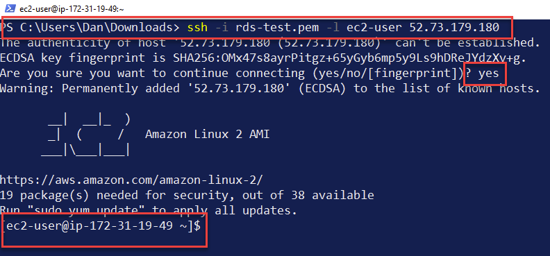 >>> ssh -i rds-test.pem -l ec2-user 52.73.179.180After typing yes to the SSH prompt, you should now be successfully SSH’d into the jump box as seen below.