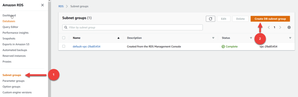 Head over to the RDS section of the AWS console and click on Subnet Groups (1) in the left hand navigation pane. Go ahead and click on Create DB subnet group to launch the creation wizard.