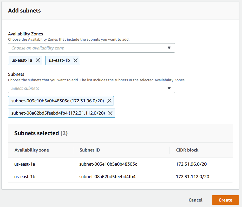 Under Availability Zones select the checkboxes for us-east-1a and us-east-1b (or whichever two regions you are using for your private subnets).