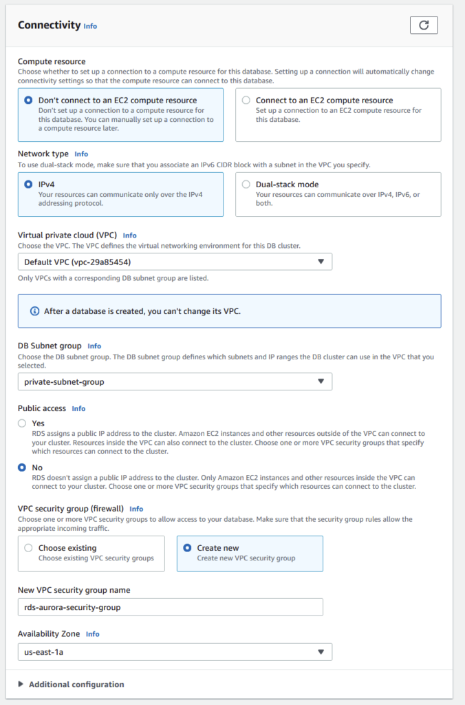 For Security Group, click Create New and name it rds-aurora-security-group. Finally, change the availability zone to 1a (the same AZ as our jump box from earlier steps).