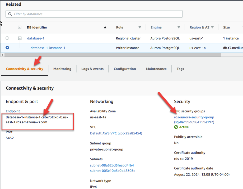 Click on your database instance and navigate to the Connectivity and Security tab and notice the link to our rds-aurora-security-group as seen below. Also notice our Database Endpoint which in my case, is database-1-instance-1.cate73txxgkb.us-east-1.rds.amazonaws.com. Copy this Endpoint to your clipboard as we’ll need it a bit later. For now, click on your security group which in my case is rds-aurora-security-group.