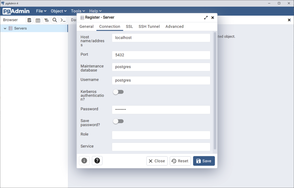 You’re now ready to connect to your database. Spin up pgAdmin and create a new connection with these settings: