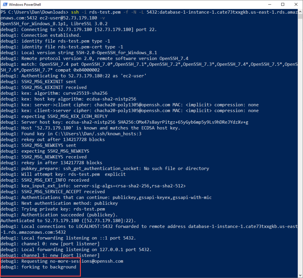 >>> ssh -i rds-test.pem -f -N -L 5432:database-1-instance-1.cate73txxgkb.us-east-1.rds.amazonaws.com:5432 ec2-user@52.73.179.180 -vThis launches a background job that forms the SSH tunnel. Your command line output should show something like the following: