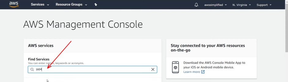 -> Log into your AWS dashboard and search for IAM (Identity Access Management) from the Find services search bar available in your dashboard