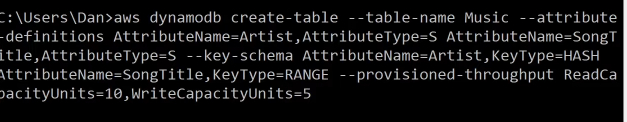 aws dynamodb create-table \ --table-name Music \ --attribute-definitions AttributeName=Artist,AttributeType=S AttributeName=SongTitle,AttributeType=S \ --key-schema AttributeName=Artist,KeyType=HASH AttributeName=SongTitle,KeyType=RANGE \ --provisioned-throughput ReadCapacityUnits=10,WriteCapacityUnits=5