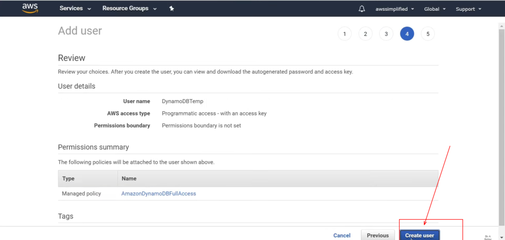 -> Now, in the next step, let’s create a username and access type. Here you are going to give yourself some DynamoDB permissions to create a table.