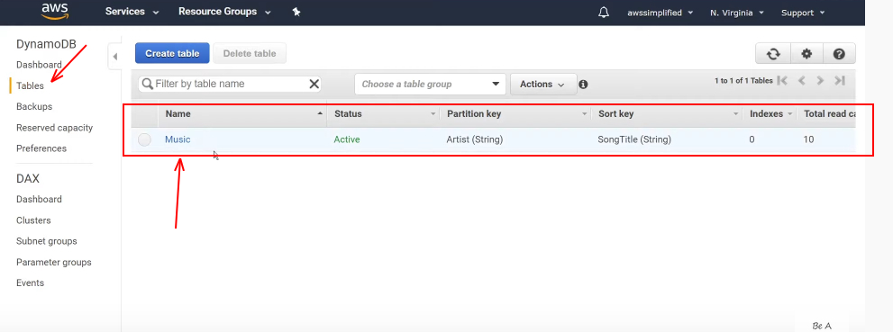Now to verify that the table is created, go back to your AWS console, go into your DynamoDB dashboard, and from there, you click on “Tables,” and right there, you should be able to see a table created with the name Music.