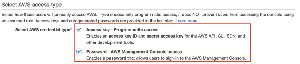 When creating an IAM user, you have the option of enabling programmatic access with this user. Doing so tells AWS to generate what are called a access key and secret access key. See the example image below.