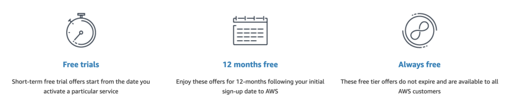 There’s also a notion of permanently free – this means certain services allow you to use them (up to a certain level) and will be permanently free. For example. with DynamoDB, you get up to 25GB of storage permanently free. For Lambda, your first 1 million requests are always free.